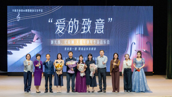 音乐鉴赏会分上下半场,谢教授为古典音乐普及精心准备了十二首经典曲目,随着《嬉游曲》悠扬的琴声响起,会场的气氛仿佛说明了一切,大家听得聚精会神,如痴如醉,除了那清澈如丝般流淌的旋律,只能偶尔听到摄影师的快门声,大家对音乐的美有着不约而同的专注和赞赏。同时我们在谢教授的讲解中感悟到这是音乐式的阅读,是一堂生动有趣鲜活的美育课,十二首乐曲让我们懂得了小调、奏鸣曲的不同曲式风格,认识了海顿,弗雷、皮亚佐拉等不同时期的古典主义作曲家,从谢教授与纪老师的音乐中听到了大提琴与钢琴的完美配合。主题曲《爱的致意》让人产生无限遐想,二位演奏家用旋律传递着他们伉俪情深,每一个音符都是恰到好处的柔和,优美;用心聆听,是交织的旋律,用眼欣赏,是一幅唯美的画。在谢教授的两位爱徒——上海音乐学院附中学生戴菲月与上海音乐学院宁波实验学校学生赵昶文身上见识了“检验演奏家技巧与修养必备的试金石”——巴赫的作品,听到带有浓郁中国新疆色彩的大提琴乐曲《节日的天山》。