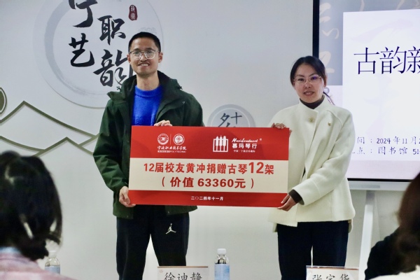 仪式上,2012届校友黄冲先生追溯了与母校的深厚渊源,同时表达了他对古琴艺术的独到见解与满腔热忱。他捐赠了12架蕴含深厚文化底蕴的古琴给“精致女生学堂”,旨在以此为契机,点燃更多人对古琴文化的浓厚兴趣与无限热爱。国际商旅学院党总支书记徐迪静对黄冲校友的善举表达了诚挚的谢意,并授予其捐赠证书,这份荣誉不仅是对校友无私奉献的感谢,更是对双方深厚情谊的铭记。