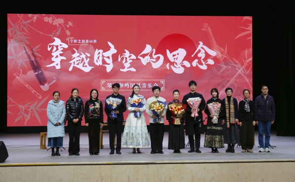 钟之岳领衔登台,与宁职院古琴教师胡蕴子一曲《神人畅》合奏开场,仿若叩开了上古玄幻之门。二人的指法灵动跳跃,配合得天衣无缝,吟猱绰注间皆如榫卯契合,毫无迟滞。此曲以琴音为笔,重绘上古祭祀盛景,天人合一的赤诚与悸动尽在弦丝跌宕间,让人沉醉不知归路。随后上演了《梅花三弄》《流水》等经典古曲,《凤鸣琴笙》《穿越时空的思念》《广陵止息》等钟之岳原创曲目与改编移植曲目,音符在其指尖下古韵流淌,时而悠远空灵,时而激昂磅礴,借弦丝演绎山水意境、文人风骨,令台下500余名师生听众如痴如醉,沉浸于古琴艺术的精妙世界,现场掌声雷动。上音高材生王哲慧、冯衍菁、魏苏宁、姚飞宇四位的独奏弦管灵动,为整场演出增色不少、音乐会终章,民乐四重奏《大鱼》扬起惊澜。笙韵俏皮穿梭,唤醒梦的涟漪;古琴沉稳低语,铺陈情感渊薮;阮音绵厚烘托,积蓄澎湃力量;箫声空灵萦绕,托举希望翱翔。四人配合完美,让人沉浸在音乐的美妙画卷流连忘返,为这场盛宴画上圆满句号。