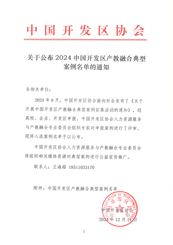 近日,数字科技园传来喜讯,园区凭借独具创新的“三园共进、院园融合” 人才培养模式成功入选2024年中国开发区产教融合典型案例。